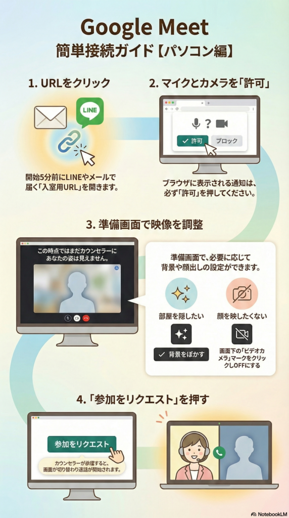 • 手順2(許可): マイクとカメラのアクセスを求められたら、必ず**「許可」**を押してください。(許可しないと、お互いの声が聞こえなくなります)