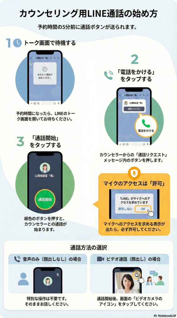 予約後にLINE通話かGoogleMeet通話のどちらかを選んでいただきます。どちらも簡単に接続可能です。詳しい接続方法については下記をご参照ください。